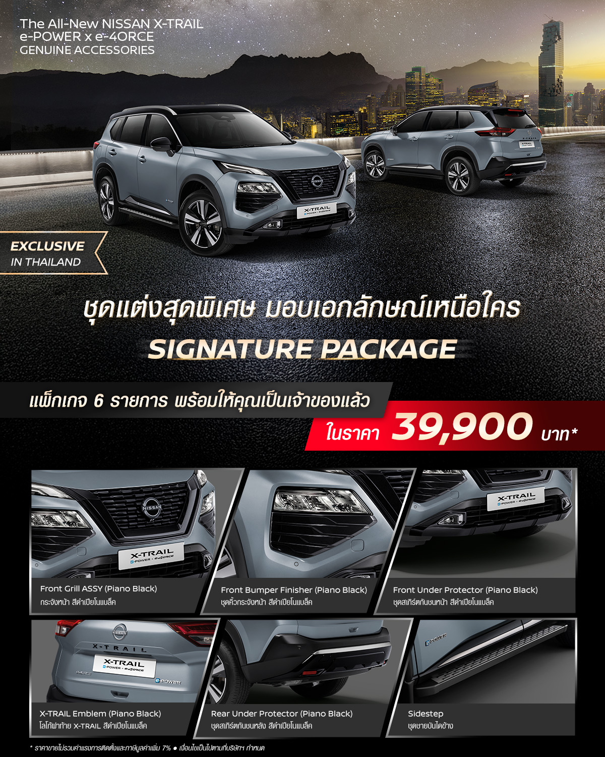 ความพิเศษเหนือระดับ ที่มอบเอกลักษณ์เหนือใคร พร้อมให้คุณเป็นเจ้าของแล้ว กับ ชุดแต่ง Signature Package ของ The All-New Nissan X-Trail e-POWER x e-4ORCE ชุดแต่งสุดพิเศษที่สร้างสรรค์เพื่อเติมเต็มความสมบูรณ์แบบแห่งดีไซน์ สะท้อนตัวตนที่แตกต่าง ด้วยรายละเอียดพิเศษ 6 รายการ สุดเอ็กซ์คลูซีฟเฉพาะประเทศไทย ประกอบด้วย